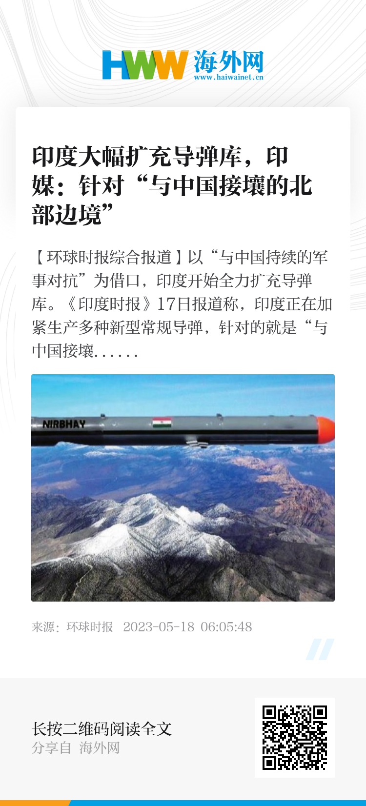 【环球时报综合报道】以“与中国持续的军事对抗”为借口,印度开始全力扩充导弹库。《印度时报》17日报道称,印度正在加紧生产多种新型常规导弹,针对的就是“与中国接壤的北部边境”。