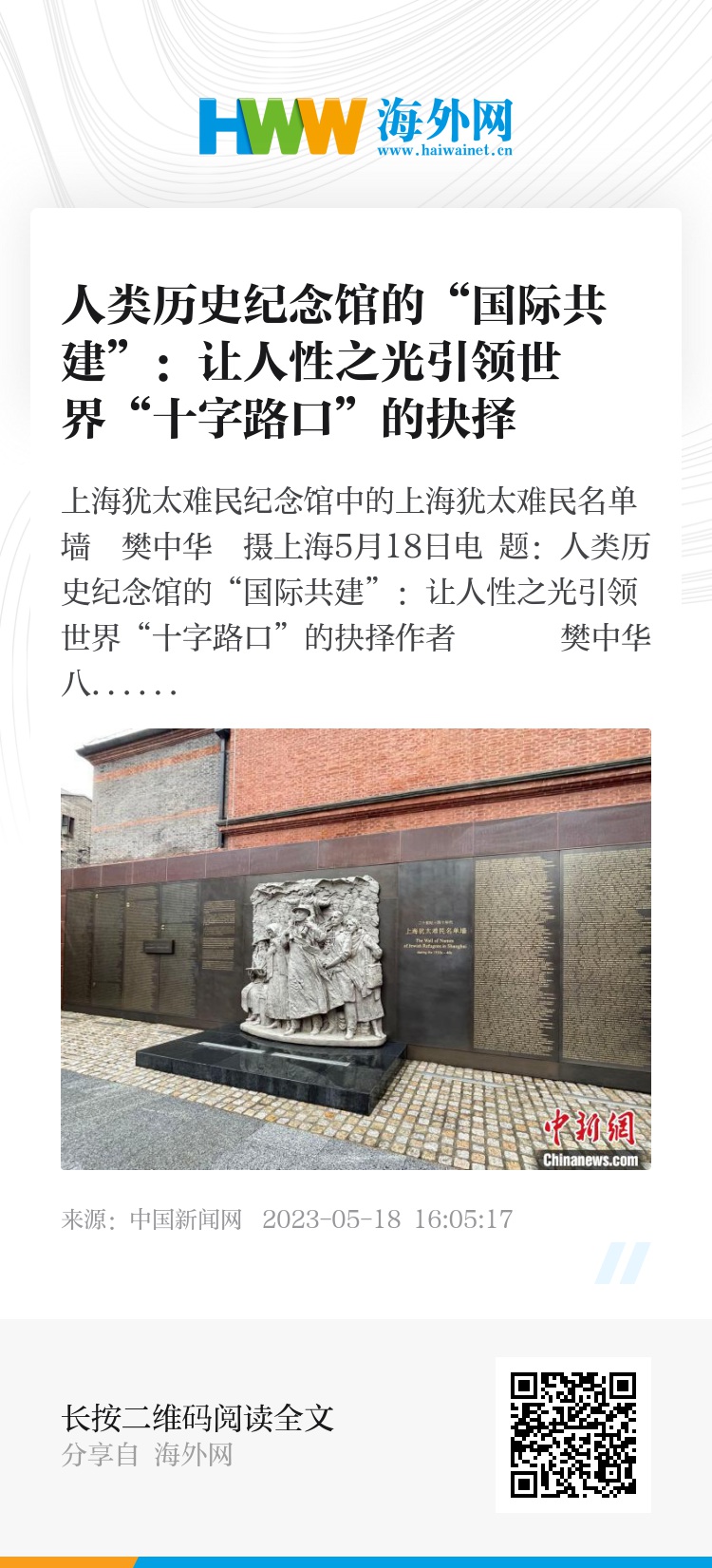 中新网上海5月18日电 题:人类历史纪念馆的“国际共建”:让人性之光引领世界“十字路口”的抉择