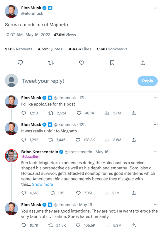 马斯克对此回复说,“你认为他们(即索罗斯及其支持者)是善意的,但他们不是。索罗斯想要侵蚀文明的根基,他仇恨人类。”