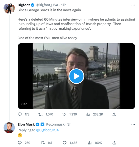 唯一被马斯克正面用文字回应的推文里,原博主称,美国《华盛顿邮报》指控马斯克在执掌推特后纵容了平台的“反犹”言论,这个观点并没有可靠证据,而且媒体不该把单纯批评索罗斯的言论算成“反犹”。