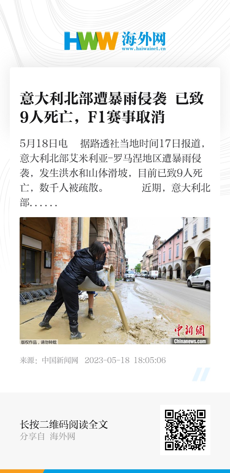 受灾情影响,原定于21日举行的一级方程式(F1)大奖赛伊莫拉站比赛取消,以减轻地方当局和应急服务部门压力。