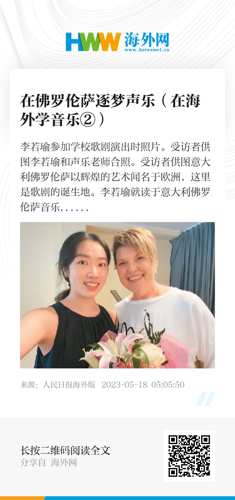 李若瑜是意大利佛罗伦萨音乐学院声乐专业的学生,从小她就喜欢唱歌。“我的父母都从事音乐相关工作,小时候我参加了不少合唱演出,拿过一些奖项,高考时明确了走声乐的专业道路。”李若瑜说。