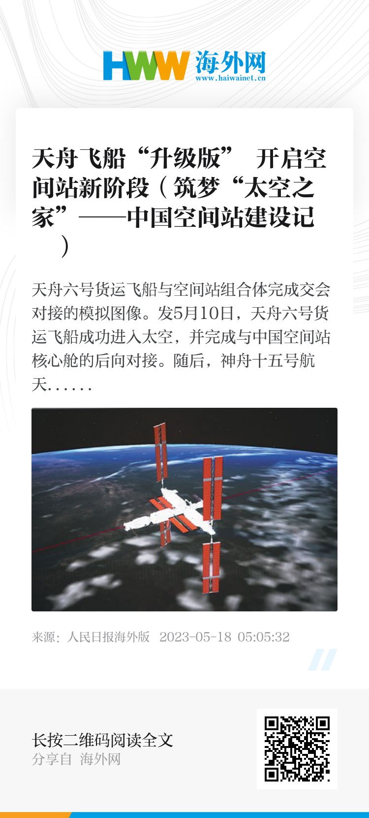 5月10日,天舟六号货运飞船成功进入太空,并完成与中国空间站核心舱的后向对接。随后,神舟十五号航天员乘组打开货运飞船舱门,按计划开展货物转运等工作。