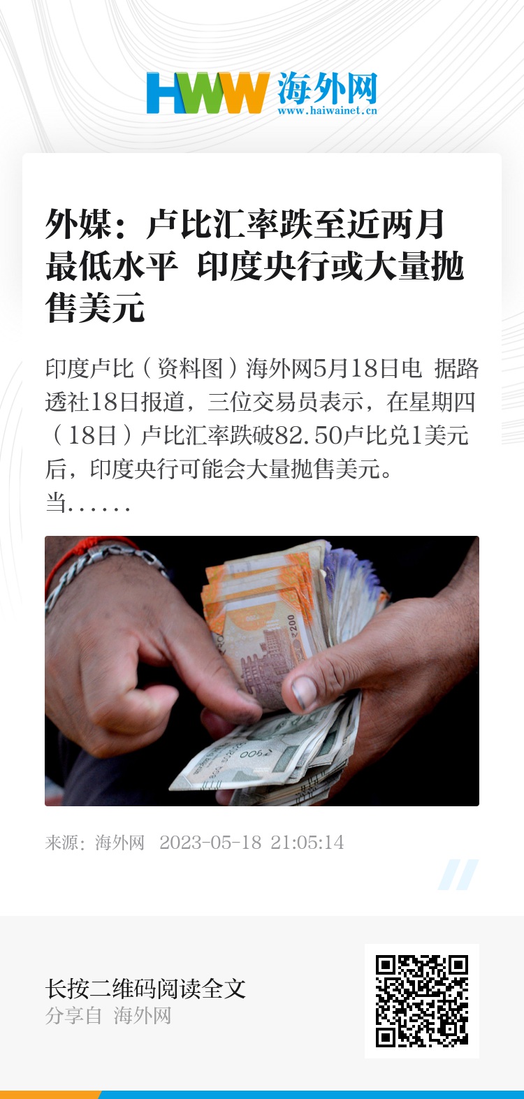海外网5月18日电 据路透社18日报道,三位交易员表示,在星期四(18日)卢比汇率跌破82.50卢比兑1美元后,印度央行可能会大量抛售美元。当前卢比的汇率处于近两个月以来的最低水平。