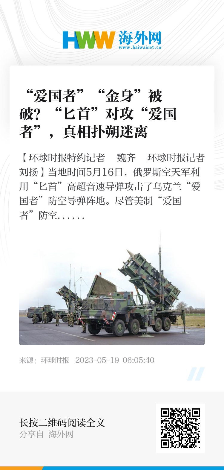 【环球时报特约记者 魏齐 环球时报记者 刘扬】当地时间5月16日,俄罗斯空天军利用“匕首”高超音速导弹攻击了乌克兰“爱国者”防空导弹阵地。尽管美制“爱国者”防空系统是被彻底摧毁,还是仅受“轻伤”,俄美双方的消息有冲突,但俄军导弹命中“爱国者”阵地是被确认了的。有分析认为,结合最近俄军加强对乌克兰弹药库等目标进行打击,俄军在对乌克兰打击的战术上有了新变化。