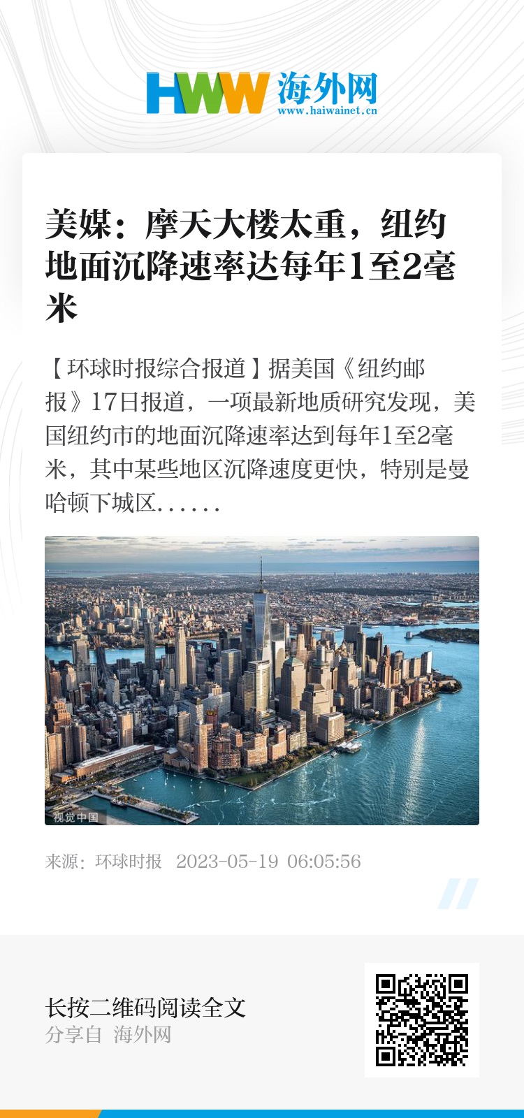【环球时报综合报道】据美国《纽约邮报》17日报道,一项最新地质研究发现,美国纽约市的地面沉降速率达到每年1至2毫米,其中某些地区沉降速度更快,特别是曼哈顿下城区、布鲁克林区、皇后区等。