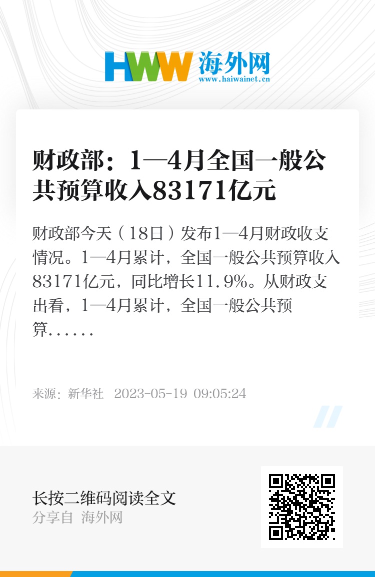 财政部今天(18日)发布1—4月财政收支情况。1—4月累计,全国一般公共预算收入83171亿元,同比增长11.9%。从财政支出看,1—4月累计,全国一般公共预算支出86418亿元,同比增长6.8%。基本民生、乡村振兴、区域重大战略、教育、科技攻关等重点支出得到有力保障。