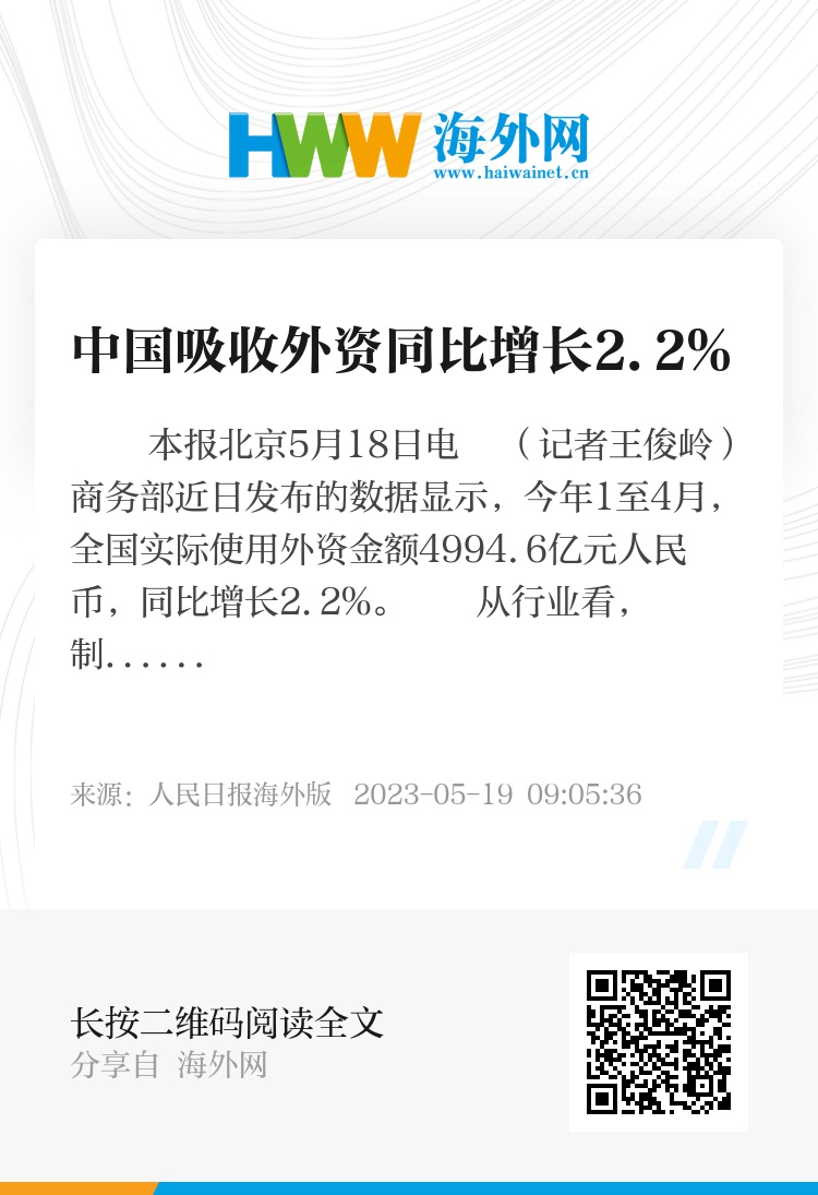 本报北京5月18日电 (记者王俊岭)商务部近日发布的数据显示,今年1至4月,全国实际使用外资金额4994.6亿元人民币,同比增长2.2%。