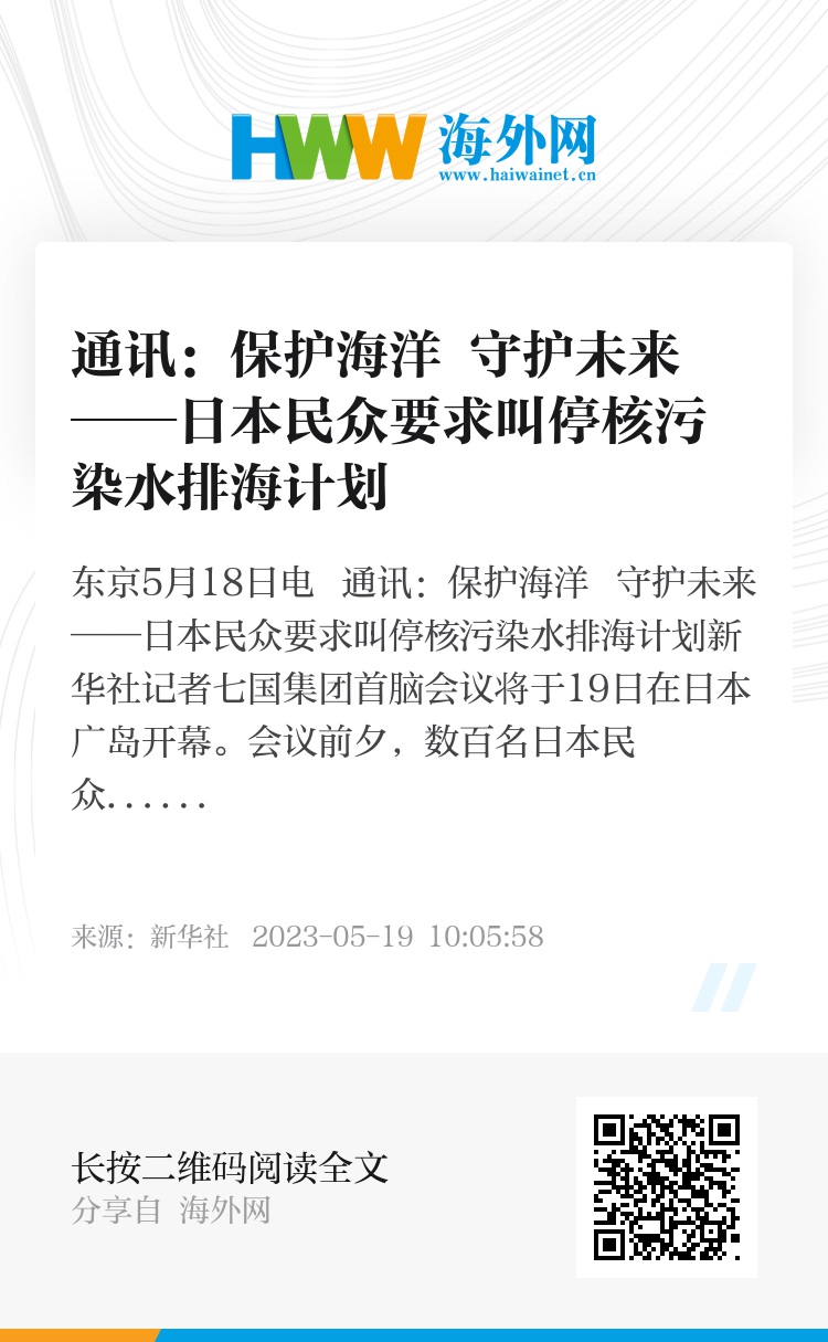 七国集团首脑会议将于19日在日本广岛开幕。会议前夕,数百名日本民众走上街头,反对将福岛第一核电站的核污染水排放入海。他们还向东京电力公司递交请愿书,要求停止排海计划。