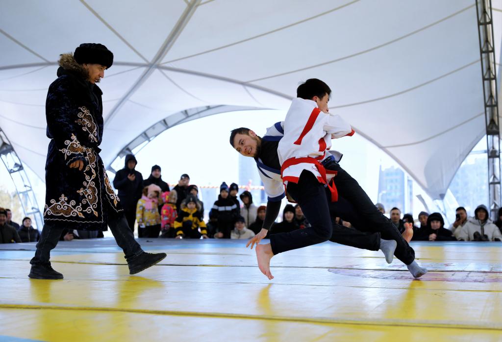 2023年3月22日,阿斯塔纳各地举行多种文化体育活动,庆祝纳乌鲁斯节。纳乌鲁斯节(又称诺鲁孜节)是中亚国家最重要的传统节日之一,标志着春天的到来和新的一年开始。新华社发(奥斯帕诺夫摄)