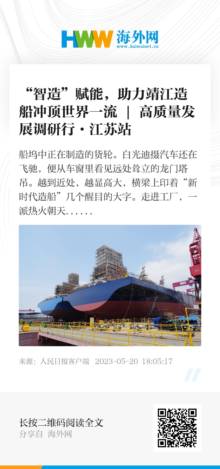 船舶产业是江苏的传统优势产业。“全国造船看江苏,江苏造船看靖江”。仅靖江市的造船企业,2022年手持订单占全球比重达10.7%,订单生产计划排到2026年。