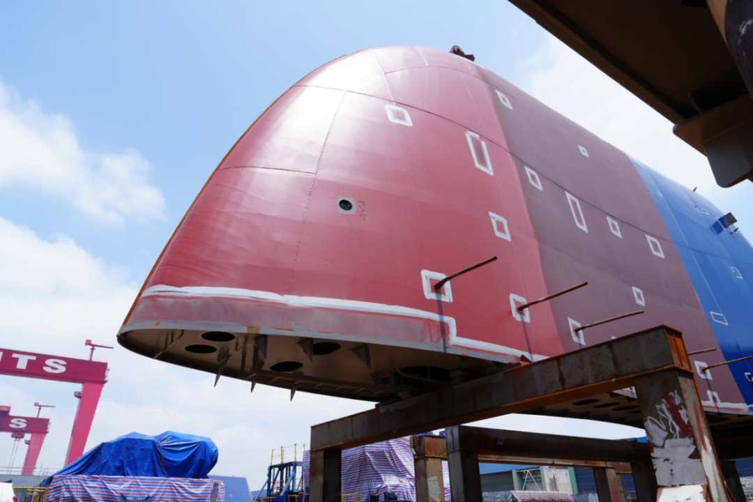 汽车还在飞驰,便从车窗里看见远处耸立的龙门塔吊。越到近处,越显高大,横梁上印着“新时代造船”几个醒目的大字。