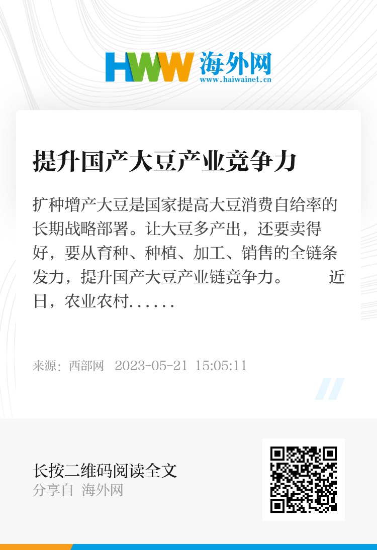 扩种增产大豆是国家提高大豆消费自给率的长期战略部署。让大豆多产出,还要卖得好,要从育种、种植、加工、销售的全链条发力,提升国产大豆产业链竞争力。