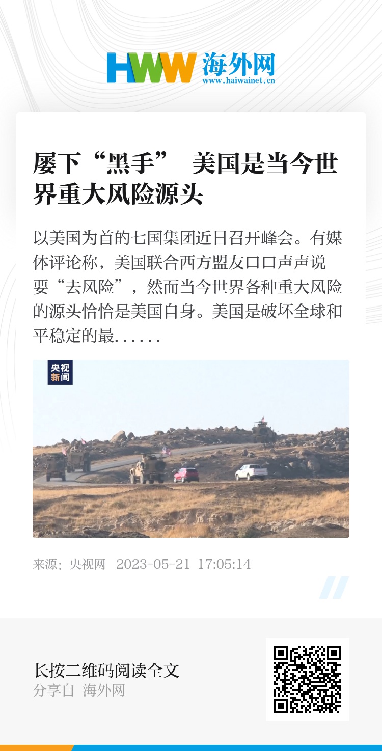 以美国为首的七国集团近日召开峰会。有媒体评论称,美国联合西方盟友口口声声说要“去风险”,然而当今世界各种重大风险的源头恰恰是美国自身。