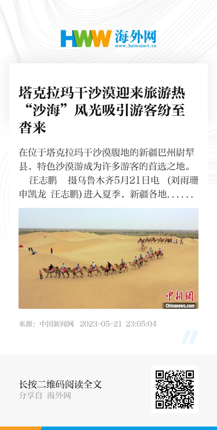 中新网乌鲁木齐5月21日电 (刘雨珊 申凯龙 汪志鹏)进入夏季,新疆各地景区迎来旅游热潮,在位于塔克拉玛干沙漠腹地的新疆巴州尉犁县,特色沙漠游也成为许多游客的首选之地。