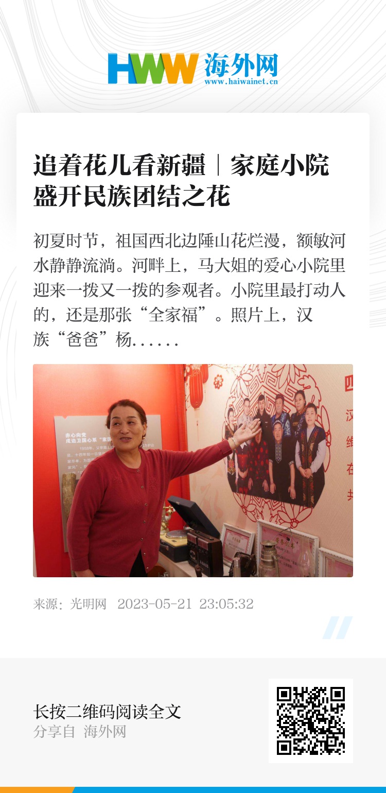 2020年,马大姐退休后继续发挥余热,将家中一间30平方米的房屋打造为“新时代文明实践点”“家庭居民党校”,让家庭小院成为居民长知识、明事理的精神家园。随着到爱心小院的人越来越多,在援疆资金的支持下,改造升级成“马新华民族团结大院”,自去年4月1日正式开放以来,已经接待2万多人参观。