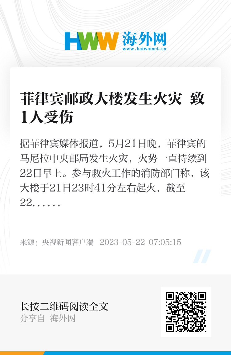 据菲律宾媒体报道,5月21日晚,菲律宾的马尼拉中央邮局发生火灾,火势一直持续到22日早上。参与救火工作的消防部门称,该大楼于21日23时41分左右起火,截至22日早上6时火势仍在持续,火灾导致1人轻伤,目前尚未有死亡报告。(总台记者 黄铮铮)