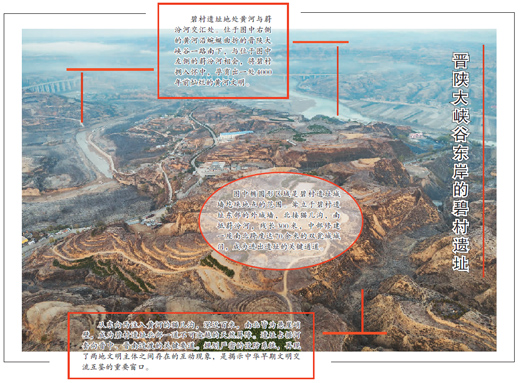 山西兴县碧村遗址位于山西省吕梁市兴县碧村村北,东距兴县县城20公里,西离陕西省神木县石峁遗址51公里。据项目负责人张光辉介绍,碧村遗址是晋陕大峡谷东岸一座拥有双重城墙的大型石城,与同时期盛极一时的石卯古国在时空上遥相呼应;其控扼黄河两岸的突出战略位置,沿外城墙、内城墙、中心台城逐步降低到入黄河口处的线性布局,以及处处把关层层设卡、背靠黄河面向东方的城防系统,彰显了浓重的防御色彩,展现了矗立于黄河东岸碧村遗址的特殊屏障作用,为解读晋陕黄河两岸地区的政治结构和文明形态提供了关键材料。