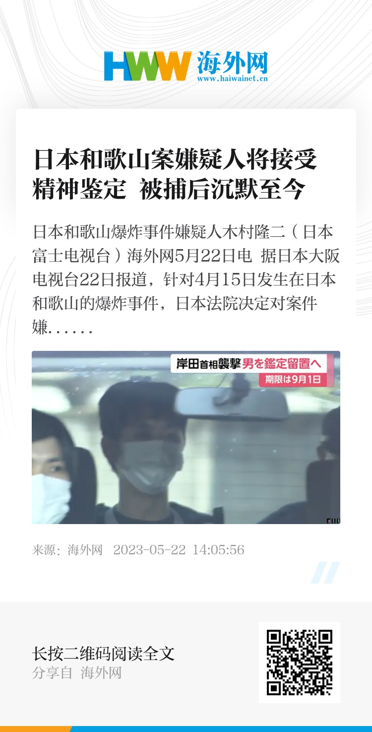 海外网5月22日电 据日本大阪电视台22日报道,针对4月15日发生在日本和歌山的爆炸事件,日本法院决定对案件嫌疑人木村隆二实施鉴定留置。