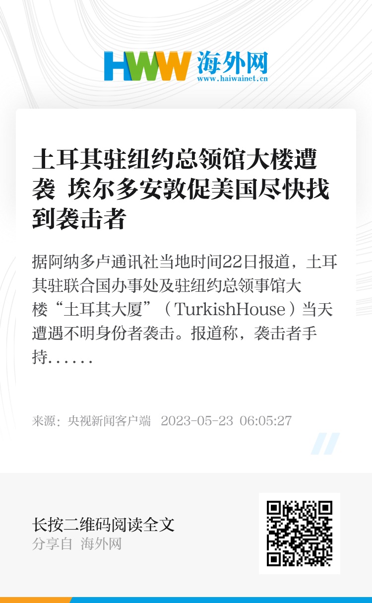 据阿纳多卢通讯社当地时间22日报道,土耳其驻联合国办事处及驻纽约总领事馆大楼“土耳其大厦”(Turkish House)当天遭遇不明身份者袭击。报道称,袭击者手持金属器具砸碎了该建筑的多个玻璃窗。自5月20日土耳其第二轮总统选举海外投票开始后,该建筑一直是驻当地土耳其公民的投票地点。