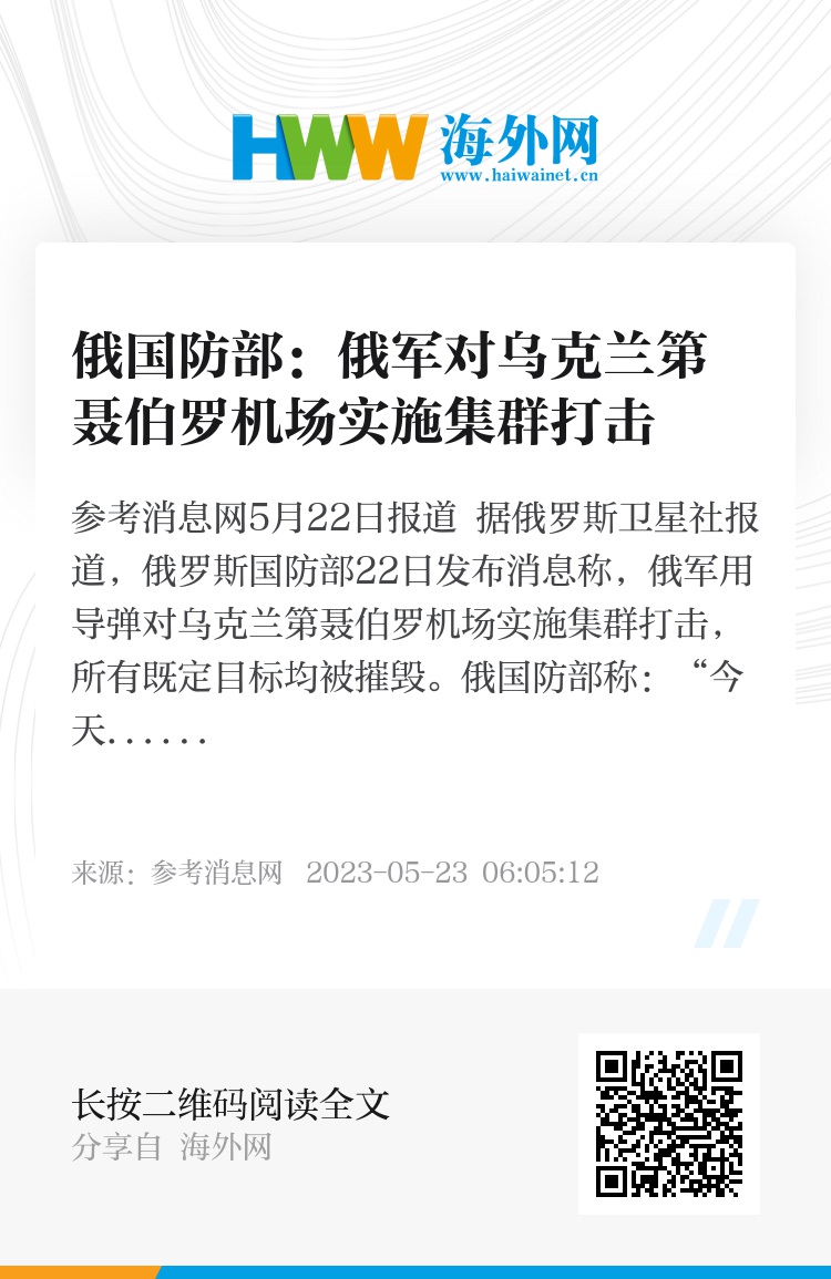参考消息网5月22日报道 据俄罗斯卫星社报道,俄罗斯国防部22日发布消息称,俄军用导弹对乌克兰第聂伯罗机场实施集群打击,所有既定目标均被摧毁。
