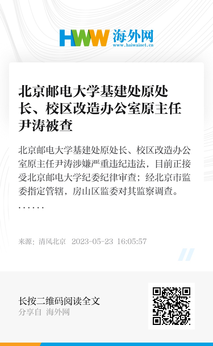 北京邮电大学基建处原处长、校区改造办公室原主任尹涛涉嫌严重违纪违法,目前正接受北京邮电大学纪委纪律审查;经北京市监委指定管辖,房山区监委对其监察调查。