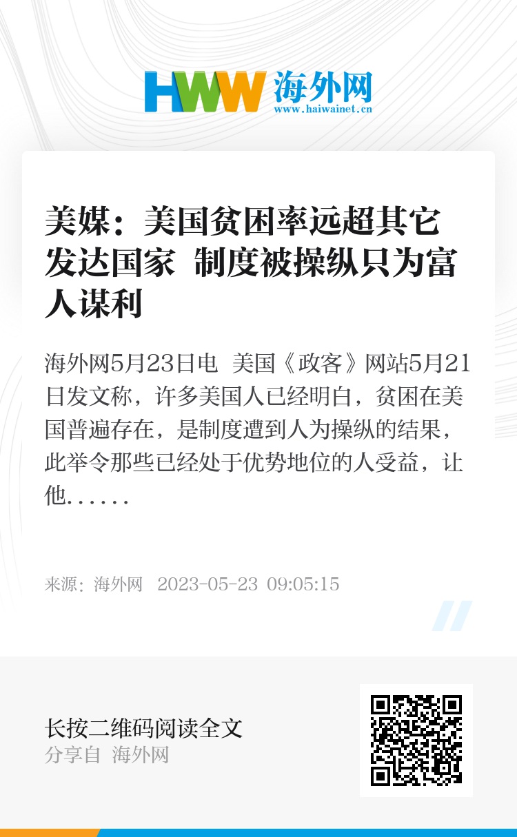 海外网5月23日电 美国《政客》网站5月21日发文称,许多美国人已经明白,贫困在美国普遍存在,是制度遭到人为操纵的结果,此举令那些已经处于优势地位的人受益,让他们继续维持富裕的生活。