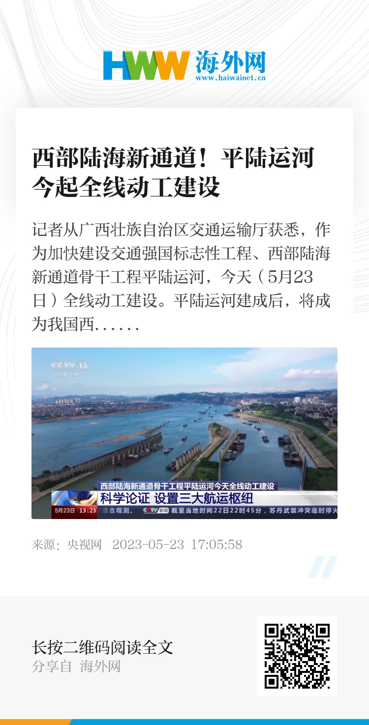 记者从广西壮族自治区交通运输厅获悉,作为加快建设交通强国标志性工程、西部陆海新通道骨干工程平陆运河,今天(5月23日)全线动工建设。平陆运河建成后,将成为我国西南地区运距最短、最经济、最便捷的出海通道。