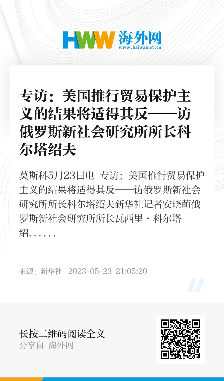 新华社莫斯科5月23日电 专访:美国推行贸易保护主义的结果将适得其反——访俄罗斯新社会研究所所长科尔塔绍夫