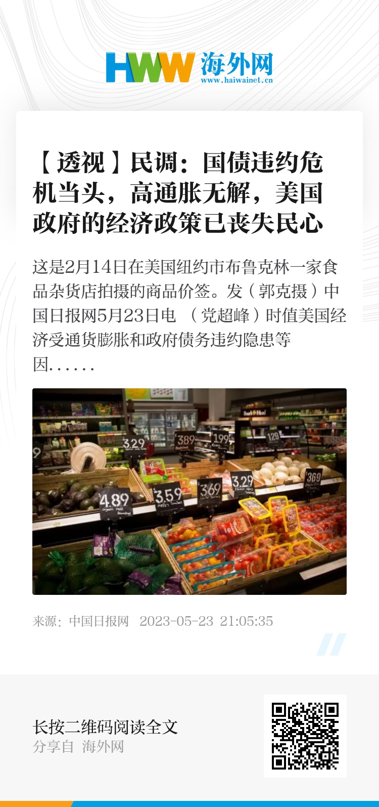 中国日报网5月23日电 (党超峰)时值美国经济受通货膨胀和政府债务违约隐患等因素拖累,美国人对于拜登政府的经济施政能力大多不满意。