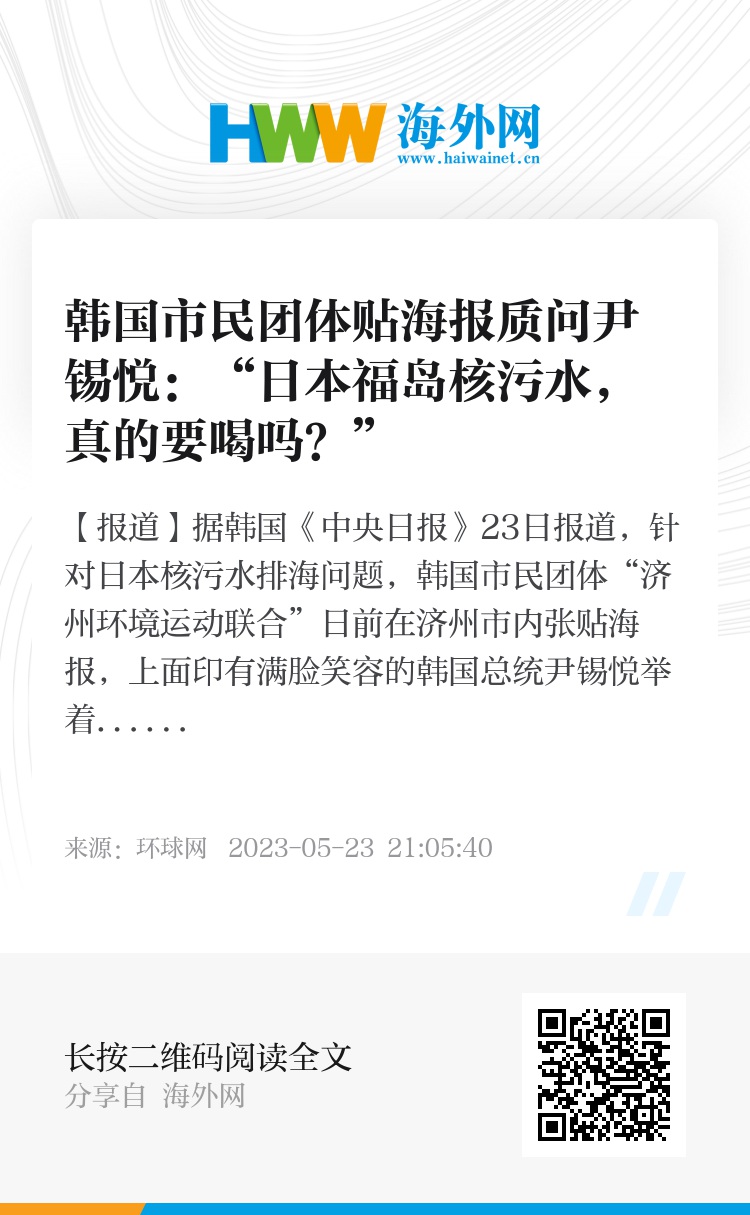 《中央日报》称,该海报系“济州环境运动联合”为了反对福岛核污水排海所制作,除了举着杯子的尹锡悦,海报背景上还印有旭日旗图案与核辐射标志,以及“日本福岛核污水,真的要喝吗”标语。警方表示,接到有关报警后,调查人员在济州市内42处发现了56张上述海报,警方认为这涉嫌违反关于室外广告的法律,已对“济州环境运动联合”的三名人员进行了立案前问询。