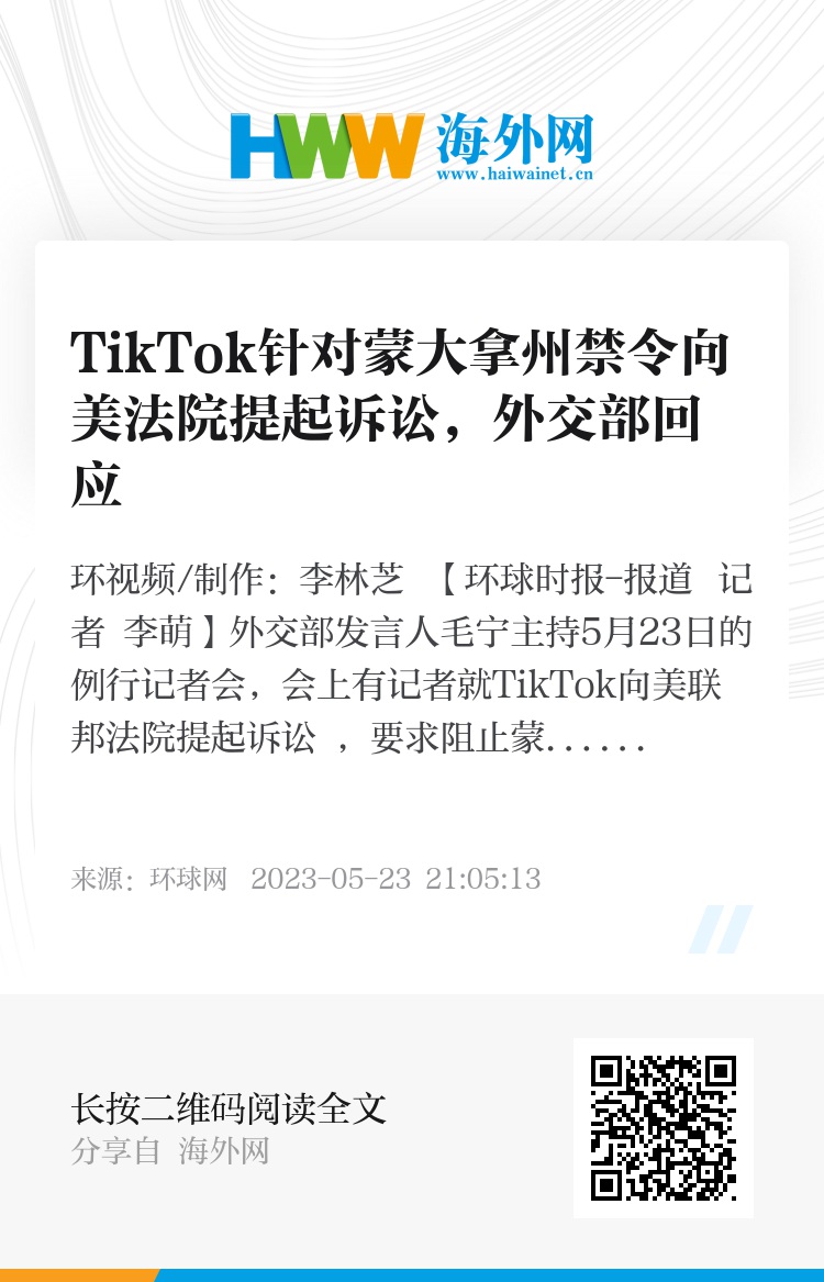【环球时报-环球网报道 记者 李萌】外交部发言人毛宁主持5月23日的例行记者会,会上有记者就TikTok向美联邦法院提起诉讼 ,要求阻止蒙大拿州实施禁令一事进行提问。