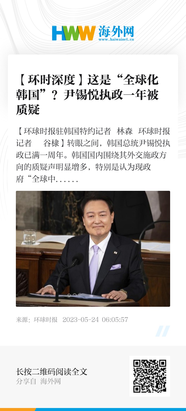【环球时报驻韩国特约记者 林森 环球时报记者 谷棣】转眼之间,韩国总统尹锡悦执政已满一周年。韩国国内围绕其外交施政方向的质疑声明显增多,特别是认为现政府“全球中枢国家”的愿景出现严重跑偏。当韩国政府为打着“全球中枢国家”旗号重点投资韩美关系而沾沾自喜时,很多韩国有识之士疾呼:不要掉入美国挖的“价值同盟陷阱”,更不要被日本当枪使!有韩国学者认为,一年前政府打出“全球中枢国家”的旗号,但现在反而成为“美国霸权从属国”和“美国双重标准的受害者”。还有学者直言不讳地表示,尹锡悦政府标榜“全球化韩国”,但现在应安静地想一想:韩国在外交的“智力”上究竟处于什么水平?