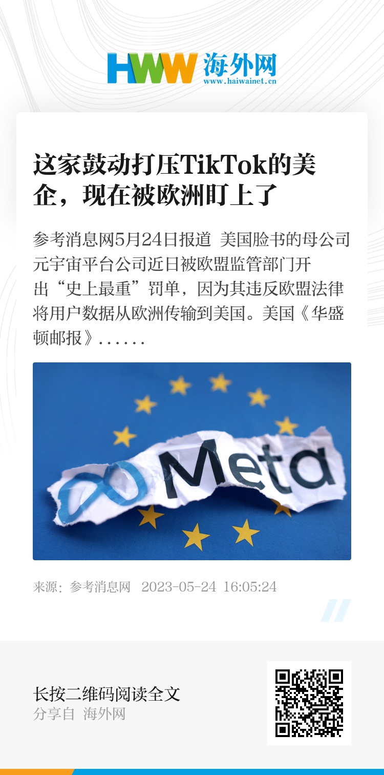 参考消息网5月24日报道 美国脸书的母公司元宇宙平台公司近日被欧盟监管部门开出“史上最重”罚单,因为其违反欧盟法律将用户数据从欧洲传输到美国。美国《华盛顿邮报》网站5月22日题为《欧洲监管者发出不想再容忍脸书的信号》的文章关注到,正是这家公司曾在美国国会展开广泛游说,竭力鼓动对TikTok进行打压。