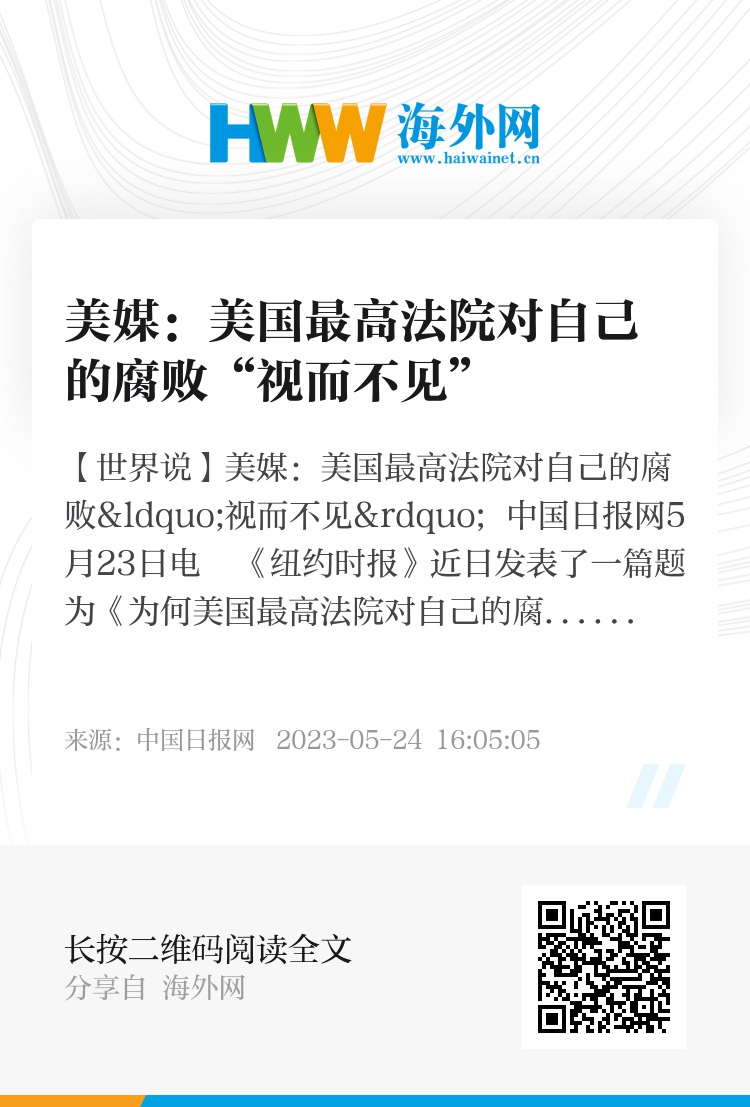 中国日报网5月23日电 《纽约时报》近日发表了一篇题为《为何美国最高法院对自己的腐败视而不见》的文章,作者称,围绕美国联邦最高法院大法官克拉伦斯·托马斯 (Clarence Thomas)的丑闻进一步削弱了公众对最高法院本已创下历史新低的信心。