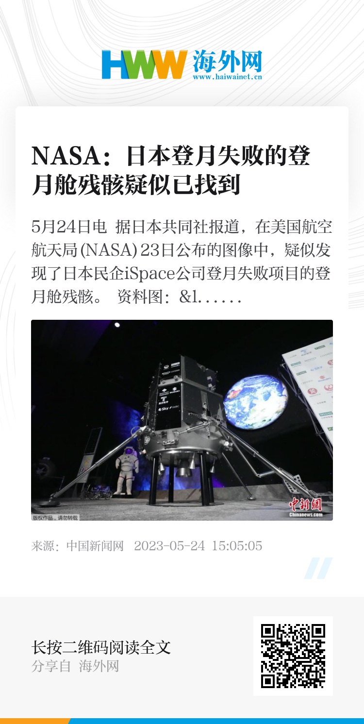 中新网5月24日电 据日本共同社报道,在美国航空航天局(NASA)23日公布的图像中,疑似发现了日本民企iSpace公司登月失败项目的登月舱残骸。