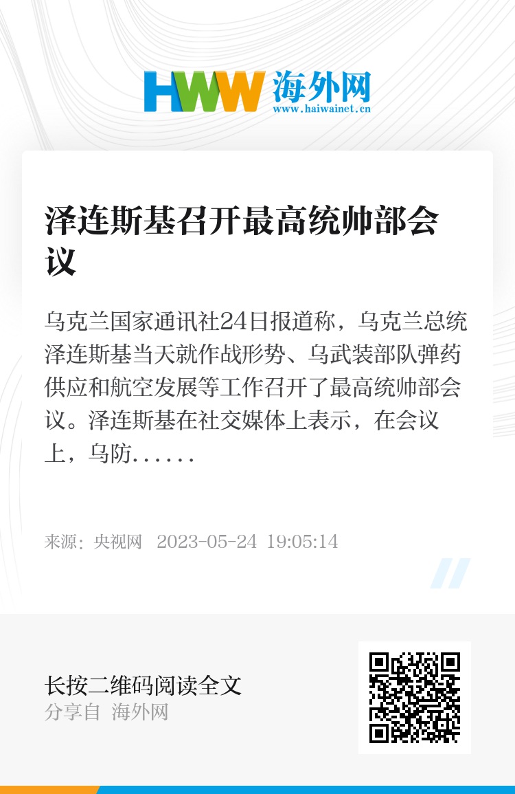 乌克兰国家通讯社24日报道称,乌克兰总统泽连斯基当天就作战形势、乌武装部队弹药供应和航空发展等工作召开了最高统帅部会议。