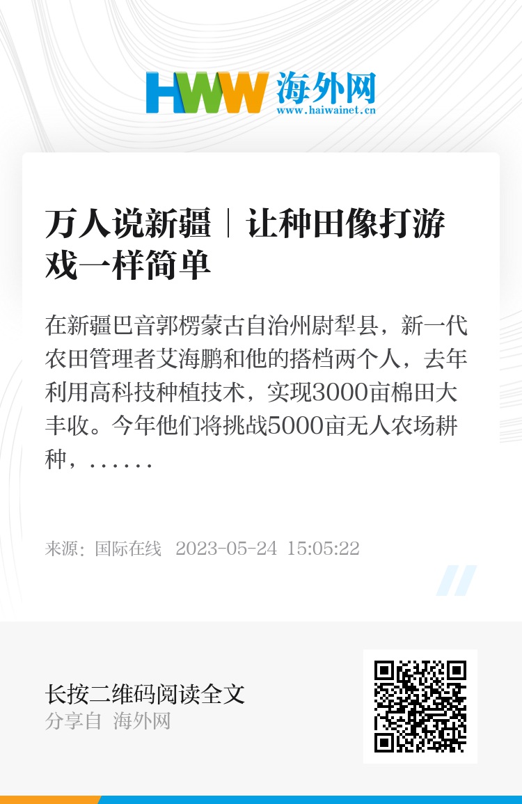 在新疆巴音郭楞蒙古自治州尉犁县,新一代农田管理者艾海鹏和他的搭档两个人,去年利用高科技种植技术,实现3000亩棉田大丰收。今年他们将挑战5000亩无人农场耕种,继续在新疆这片大有可为的土地上,完成科技创新梦。他说,他的终极愿景就是让种田像打游戏一样简单,让农民实实在在感受到农业现代化的成果。