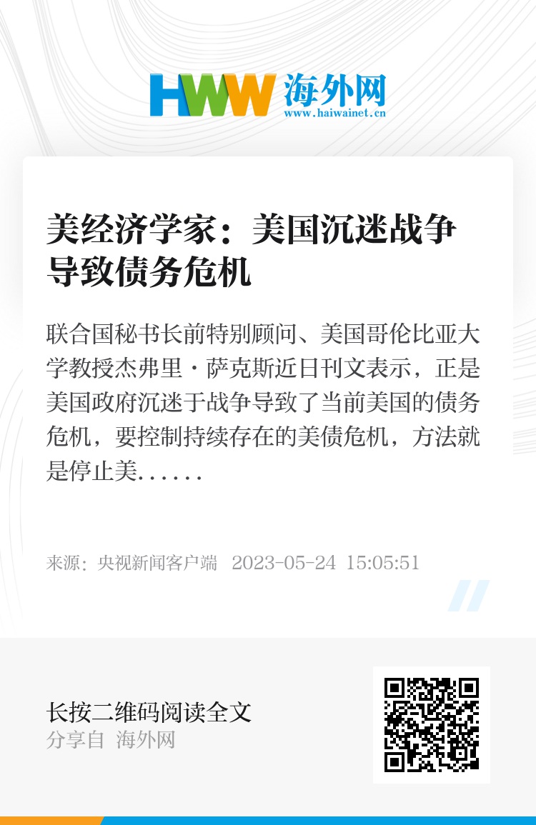 杰弗里·萨克斯在文章中指出,美国政府债务背后,除了2008年金融危机和新冠疫情造成的财政赤字,主要原因就是美国发动战争的巨大花费。文章引用美国布朗大学“战争代价”研究项目报告数据称,2001财年到2022财年间,美国用于战争的费用超过8万亿美元。美国政府债务高企主要是由美国“沉迷于战争和军费开支”造成的。文章警告,美国国会预算办公室数据显示,如果美国保持当前政策不变,到2052年美债将达到国内生产总值的185%。