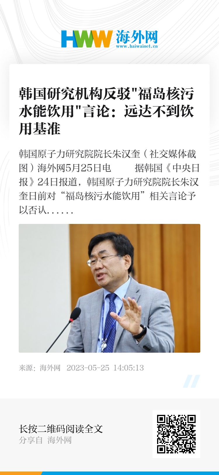海外网5月25日电 据韩国《中央日报》24日报道,韩国原子力研究院院长朱汉奎日前对“福岛核污水能饮用”相关言论予以否认,称按研究院官方立场来看,核污水远达不到饮用标准。