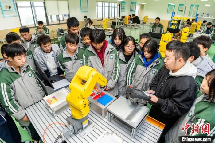 2022年12月,在浙江省瑞安市瑞立职业技术学校,来自四川省南部县脱贫户家庭的孩子们正在教室学习机械手臂操作。孙凛 摄