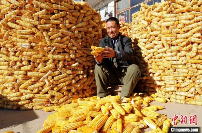 2018年11月,在河北省张家口市宣化区北庄子村,农民顾宝军在整理收获的玉米。陈晓东 摄