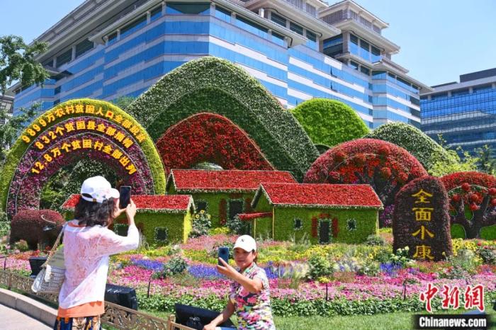 2021年6月,北京街头的“全面小康”花坛吸引游客拍照。胡庆明 摄
