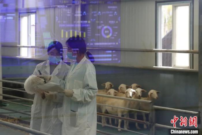2021年10月,陕西省榆林市榆阳区常乐堡村湖羊养殖基地,检测实验室的工作人员进行采样。该基地带动5000户农户种草、1000户农户养殖脱贫。韩海丹 摄