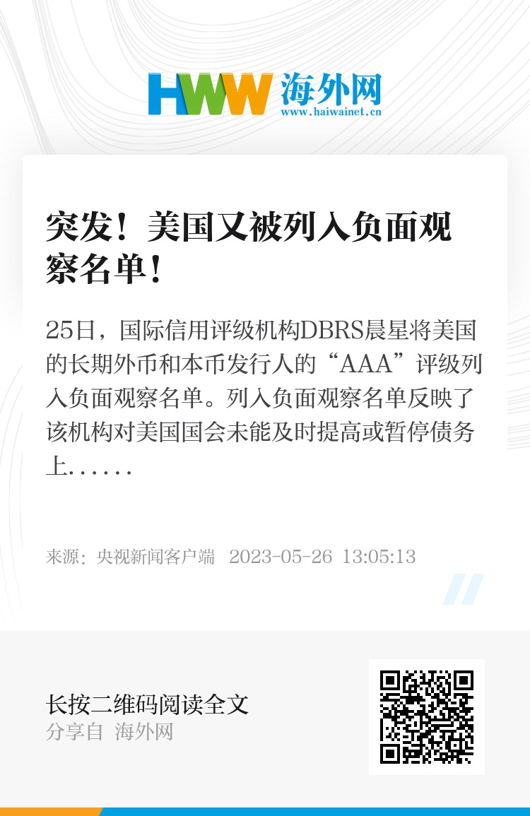 25日,国际信用评级机构DBRS晨星将美国的长期外币和本币发行人的“AAA”评级列入负面观察名单。列入负面观察名单反映了该机构对美国国会未能及时提高或暂停债务上限风险的担忧,如果美国国会不采取行动,美国联邦政府将无法履行其所有支付义务。