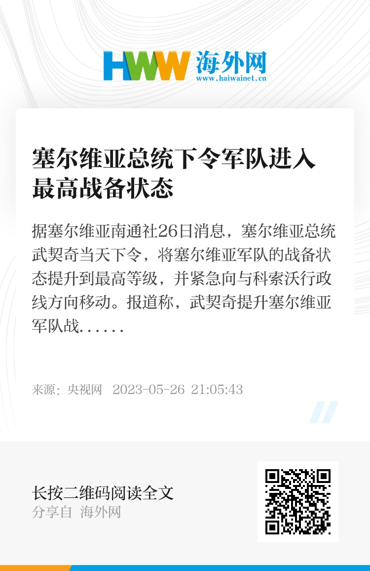 据塞尔维亚南通社26日消息,塞尔维亚总统武契奇当天下令,将塞尔维亚军队的战备状态提升到最高等级,并紧急向与科索沃行政线方向移动。