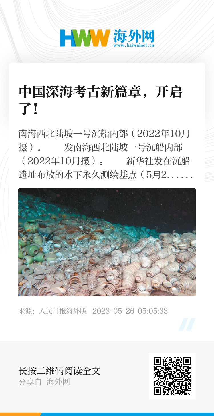 据新华网报道,5月20日,国家文物局主要负责同志乘坐“深海勇士”号载人潜水器参加了南海西北陆坡一号沉船第一次考古调查,在沉船遗址核心堆积区西南角布放水下永久测绘基点,并进行了初步搜索调查和影像记录,正式启动了南海西北陆坡一号、二号古代沉船遗址的考古调查工作,开启了我国深海考古的新篇章。