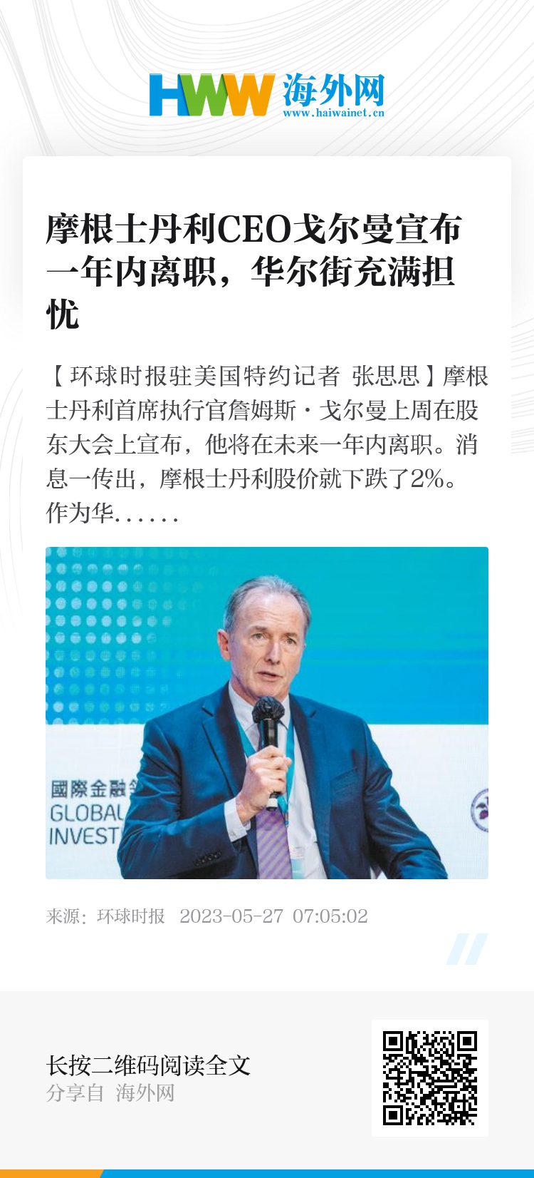【环球时报驻美国特约记者 张思思】摩根士丹利首席执行官詹姆斯·戈尔曼上周在股东大会上宣布,他将在未来一年内离职。消息一传出,摩根士丹利股价就下跌了2%。作为华尔街任职时间最长的CEO之一,戈尔曼凭借过往的专业经验和低调、踏实的作风,改革公司业务模式,带领摩根士丹利走上了一条稳健的发展道路。在这个银行业经历一系列危机的时间点,他即将离职的消息让市场充满担忧。