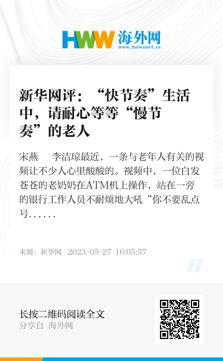 对家中的老人多点耐心、多点陪伴,在外遇到老年人寻求帮助或者需要提供服务时,不妨也将他们当做自家老人对待。尤其是像银行、医院这样服务机构的工作人员,更应该对操作新事物存在困难的老年人多点宽容和耐心,提供良好周到的人性化服务。