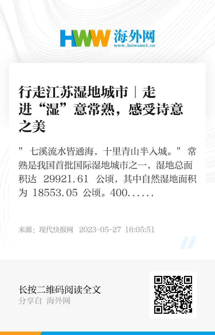 " 七溪流水皆通海,十里青山半入城。" 常熟是我国首批国际湿地城市之一,湿地总面积达 29921.61 公顷,其中自然湿地面积为 18553.05 公顷。4000 多个湿地错落有致,如同一颗颗绿宝石镶嵌在常熟版图上,其中,沙家浜国家湿地公园和尚湖国家城市湿地公园是最亮眼的存在。5 月 26 日," 行走江苏湿地城市 " 采访活动走进常熟,来自全国各地的媒体人沉浸式体验常熟湿地的魅力风光,看到了 " 绿水青山就是金山银山 " 的现实图景。